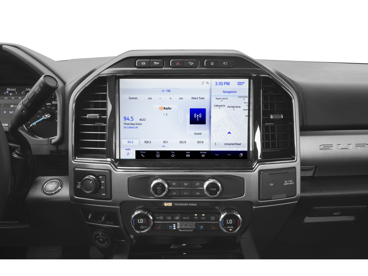 • SYNC 4 w/Enhanced Voice Recognition -inc: 12" LCD capacitive touchscreen w/swipe capability, information on demand panel, wireless phone connection, cloud connected, AppLink w/app catalog, 911 assist, Apple CarPlay and Android Auto compatibility, digital owner's manual, conversational voice command recognition and connected built-in navigation w/complimentary 3-year trial for eligible vehicles that begins on the new vehicle warranty start date, Customers must unlock the navigation service trial by activating the eligible vehicle w/a FordPass member account, If not subscribed by the end of the complimentary period, the connected navigation service will terminate, and the system will revert to embedded offline navigation, Navigation services require SYNC4 and Ford Pass Connect (optional on select vehicles), complimentary connect service and the FordPass app (see FordPass terms for details), Connected service and features depend on compatible AT&T network availability, Evolving technology/cellular networks/vehicle capability may limit functionality and prevent operation of connected features, FordPass app, compatible w/select smartphone platforms, is available via a download, Message and data rates may apply